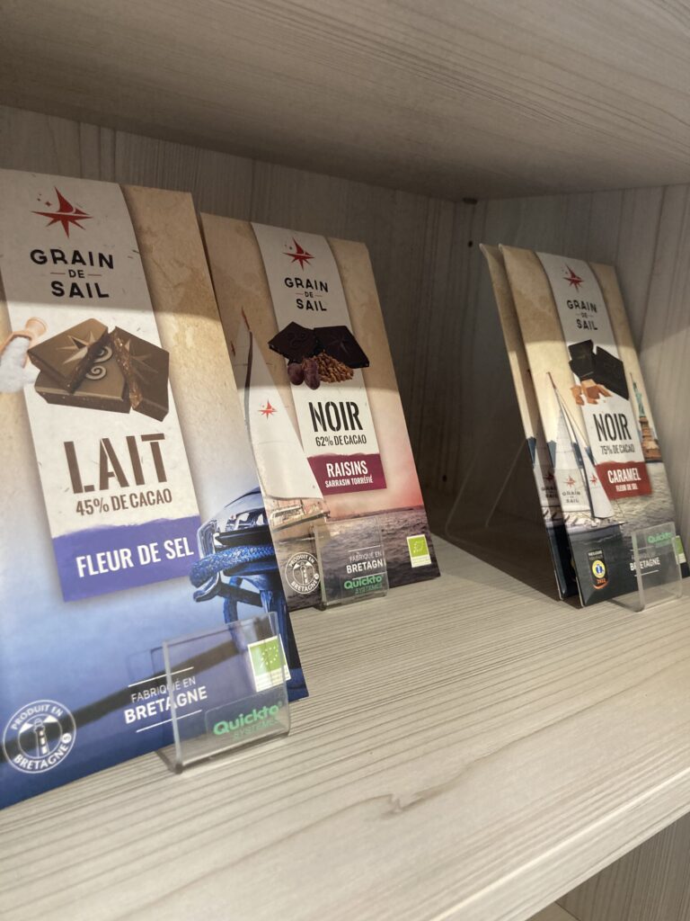 « Les chocolats sont soigneusement élaborés et produits à Morlaix. En particulier, la technique de conchage appliquée aux cacaos permet d’atteindre une qualité de chocolat optimum et de proposer des recettes simples et savoureuses. » Leur gamme s’étend à 18 références de tablettes de chocolat noir et lait, confectionnés grâce à des outils industriels de pointe et aux compétences de nos équipes ainsi qu’à celles des travailleurs en situation de handicap issus d’associations d’aide à l’emploi.